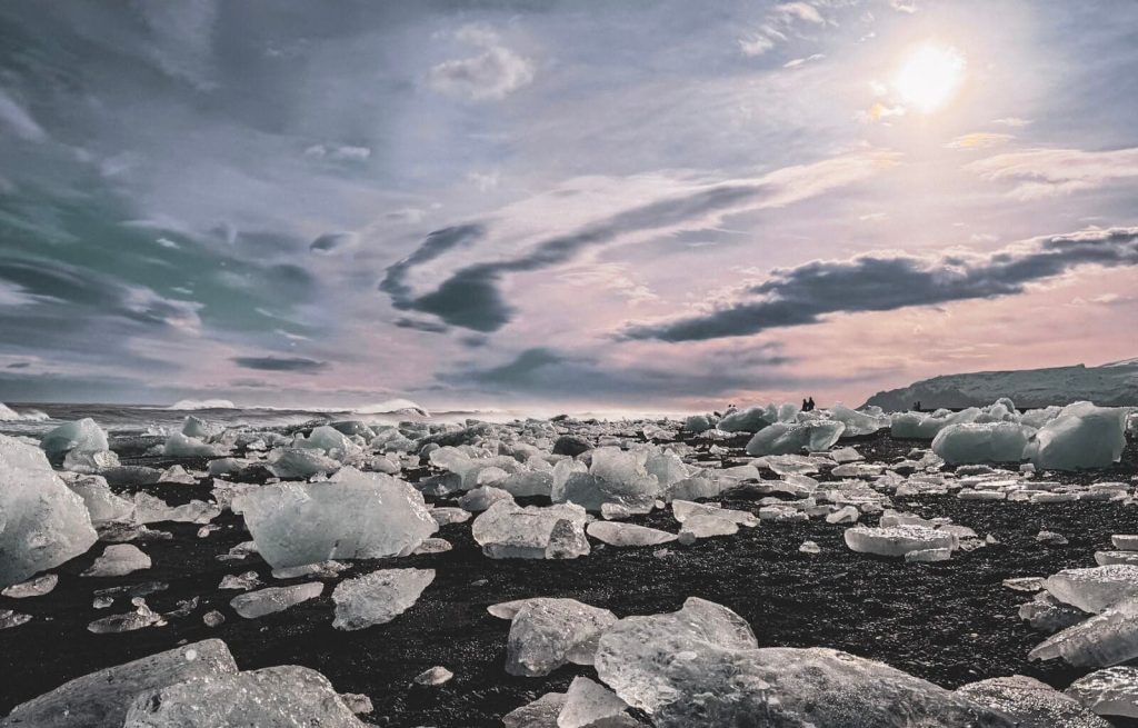 The Diamond Beach, also known as Breidamerkursandur, is a beach located on the south coast of Iceland, near Jokulsarlon glacier lagoon. The beach is famous for its black sand and icebergs that wash up on the shore, resembling sparkling diamonds
